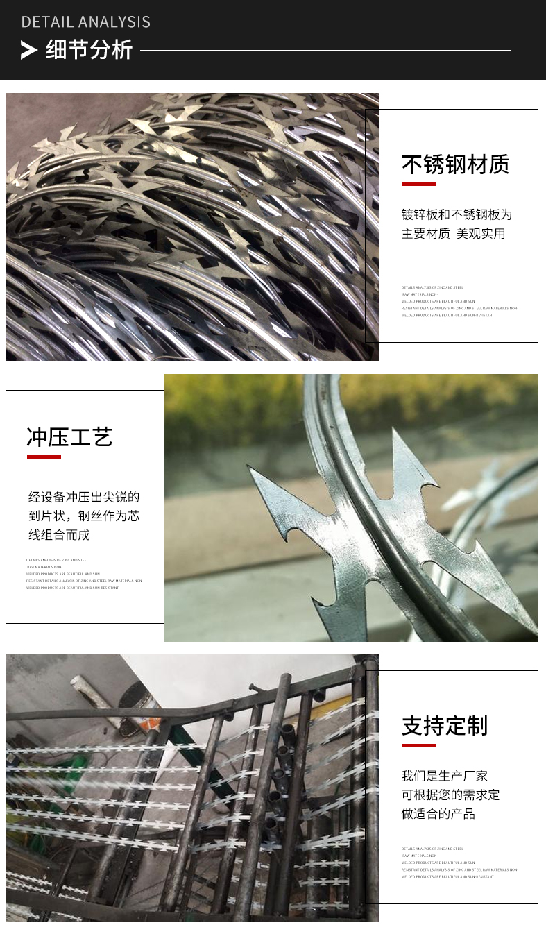 17832289222刺繩護欄網又稱刀片刺網護欄,是在兩條刀片刺網之間以不銹鋼片和鍍鋅鋼片強力夾扣,展開后即呈交叉狀,本產品具有防腐、防老化、抗曬、耐候等特點。刺繩護欄網具有防腐、防老化、抗曬、耐候等特點。防腐形式有電鍍、熱鍍。刺繩護欄網按照安裝方法不同可分為:(蛇腹式) 螺旋式刀片刺繩,直線型刀片刺繩,平板式刀片刺繩,刀片刺繩焊接網等。刺繩護欄網按照安裝方法不同可分為:(蛇腹式) 螺旋式刀片刺繩,直線型刀片刺繩,平板