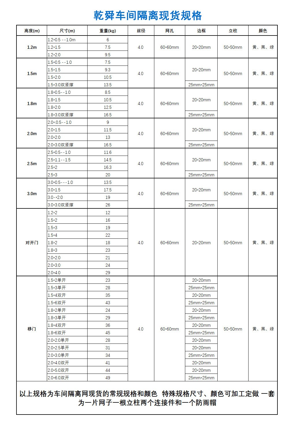 高 度:1.2m、1.5m、1.8m、2.0m、2.5m、3.0m