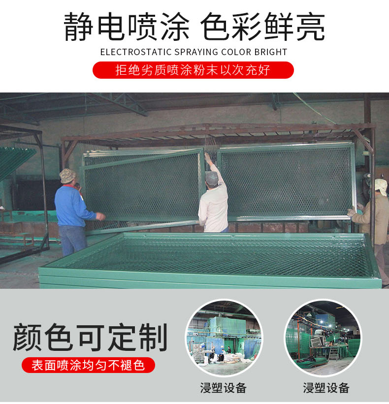 高速公路隔離柵是一種具有耐腐蝕、抗老化、耐酸堿、表面平整、光亮、手感舒適等優點的防護網產品,并且安裝簡便,美觀大方,各種顏色的隔離網裝點出一個多彩的世界。高速公路隔離網采用低碳鋼絲、鋁鎂合金絲,噴塑,編織焊接而成,網格結構簡練、便于運輸、安裝不受地形起伏限制,對于山地、坡地、多彎地帶適應性特強,具有其他結構隔離柵無法比擬的優點。高速公路隔離網一般產品規格:1、浸塑絲經 4.5--5.5mm2、網孔