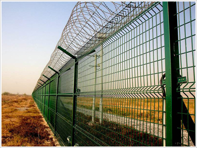 特點:如果在機場護欄網頂部加裝刀片刺絲、刀片刺繩后又很好的增強了安全防護性能。采用電鍍、熱鍍、噴塑、浸塑等防腐形式,具有很好的抗老化、抗曬、耐候等特點。其產品造型美觀、花色多樣,既起到圍欄作用,又起到美化作用。由于具有安全性高、防攀爬能力好,網片連接方式采用特制SBS緊扣件,有效防止人為的破壞性拆卸,橫向四道折彎加強筋,使網面強度顯著增加。